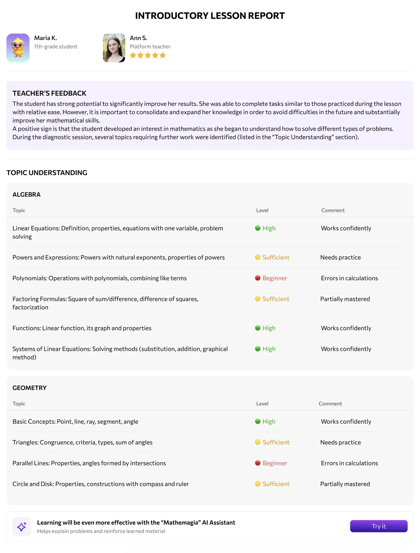 Short quizzes, AI assistant tips, regular lessons β it's a system that shapes not just grades, but mathemagical thinking.